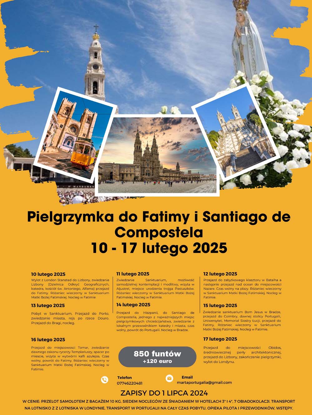 Przejazd do miejscowości Obidos, średniowiecznej perły architektonicznej, przejazd do Lizbony, zakończenie pielgrzymki, wylot do Londynu.