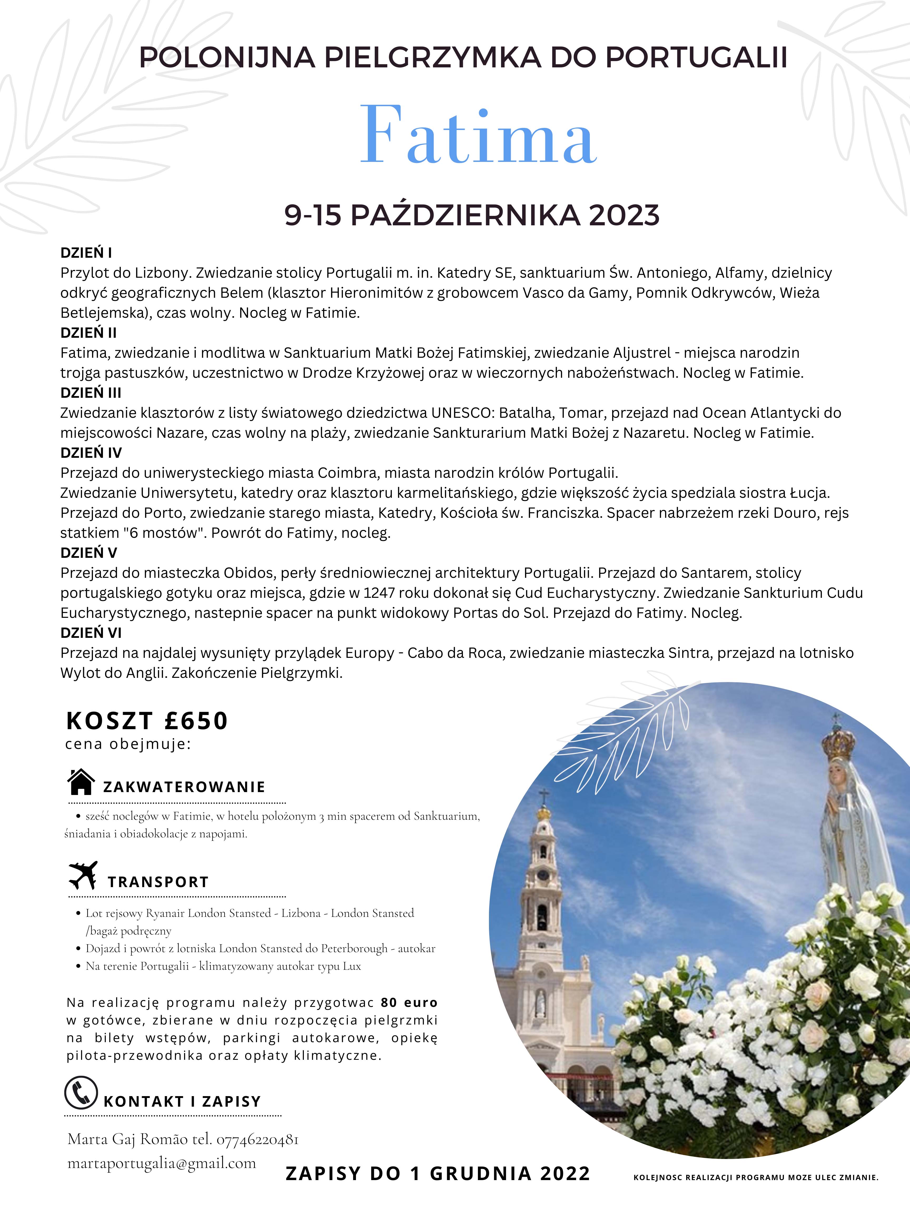 14. Zapraszamy na pielgrzymkę do Fatimy i innych zakątków Portugalii w dniach 9 – 15 października 2023 roku. Zapisy do 1 grudnia 2022!!! Kontakt i zapisy: Pani Marta Gaj Romão, tel. 07746220481, Ten adres pocztowy jest chroniony przed spamowaniem. Aby go zobaczyć, konieczne jest włączenie w przeglądarce obsługi JavaScript.. Szczegóły na plakacie przy wyjściu ze świątyni, na facebooku i stronie internetowej parafii.