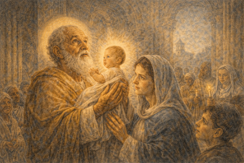 Gdy dobiegły końca dni ich oczyszczenia według Prawa Mojżeszowego, Maryja i Józef zabrali Jezusa do Jerozolimy, aby przedstawić Go Panu, jak napisano w Prawie Pańskim: „Każdy mężczyzna, który otwiera łono, będzie poświęcić się Panu” i złożyć ofiarę z „pary synogarlic albo dwóch młodych gołębi”, zgodnie z nakazem Prawa Pańskiego.